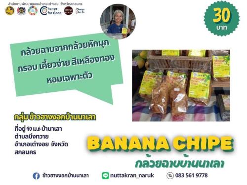 สำนักงานพัฒนาชุมชนอำเภอเต่างอยขอเชิญชวนและประชาสัมพันธ์สั่งซื้อสินค้าของกลุ่มโอทอป อำเภอเต่างอย กลุ่มข้าวฮางงอกบ้านนาเลา หมู่ที่ 6 ตำบลบึงทวาย กล้วยฉาบทำจากกล้วยหักมุก รสชาด กรอบ หอม หวาน