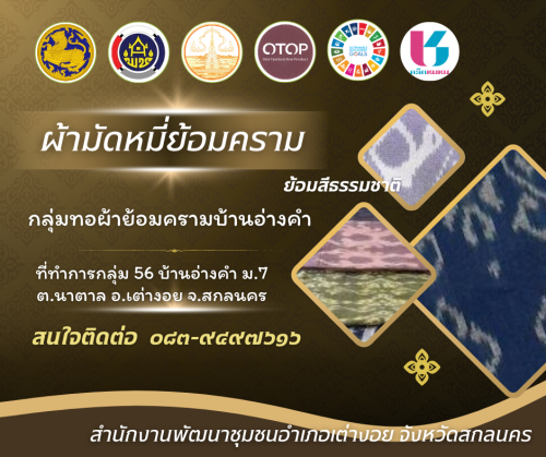 “ร้านค้าใน Shopชุมชน “ กลุ่มทอผ้าย้อมครามบ้านอ่างคำ บ้านเลขที่ 56 ม.7 ต.นาตาล อ.เต่างอย จ.สกลนคร สนใจติดต่อได้ที่เบอร์ 083-4947616
